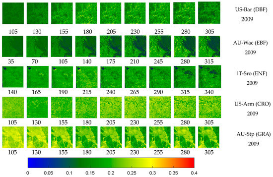 We validated the proposed assimilation algorithm on five types of land surface areas, each area containing a ground-based station. The five stations, as mentioned above, were US-Bar, AU-Wac, IT-Sro, US-Arm, and AU-Stp (Table 1). The results are shown in Figure 7. The daily estimation result was difficult to display and the beginning date for each site was different, so we used nine days-worth of estimation results from each site.