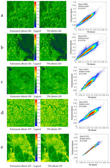 The direct estimation approach simulates TOA reflectance from radiative transfer information. Here, the sensor spectral response functions obtained from the USGS and the MODIS BRDF database were used as inputs for the 6S radiative transfer code, aerosol types, water vapor, ozone, and CO2. The linear regression coefficients for each of the geometrical combinations were precalculated and stored in LUTs for operational use. TOA reflectance was simulated using the regression models in the LUT. Cloud-free observations were selected from the quality control document, then the TM surface albedo was obtained from TOA reflectance data. The direct estimation approach has been successfully applied to Landsat Multispectral Scanner (MSS), Thematic Mapper (TM), Enhanced Thematic Mapper Plus (ETM+), and Operational Land Imager (OLI) sensors [18]; extensive validations have also been carried out at SURFRAD, AmeriFlux, BSRN, and GC-Net sites. The direct estimation approach can generate reliable surface albedo estimates with accuracy of 0.022 to 0.034 in terms of RMSEs over snow-free surfaces [44,45]. The direct estimation approach has also been used in OLI and Gaofen-1 satellite (GF-1) surface albedo inversion [46,47].
