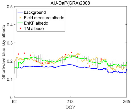 In the data assimilation algorithm, the background field is a preliminary estimate of target parameters, which is obtained from historical and empirical data, and reflects the general variation trend of the estimator [54]. Our EnKF algorithm results were obtained based on the optimal estimation of the current time. The background field trend introduces an observation increment in the optimal weight, so its accuracy is very important. We conducted spatial registration before constructing the background; after processing, the projection mode and resolution of MODIS data were consistent with Landsat. MODIS data actually provides background fields and dynamic models (preliminary estimates), so errors do exist, but they are allowed under the assimilation algorithm. Surface albedo presents a certain regularity in the growing season. We averaged the historical MODIS data, instead of the contemporary MODIS data, as the albedo background field because MODIS data were missing across our study area [55]. Consider the AU-DaP site as an example: The background field albedo has the same change trend as the original MODIS albedo, but with no missing data and an overall smoother structure. To this effect, the background field is more suitable for data assimilation.