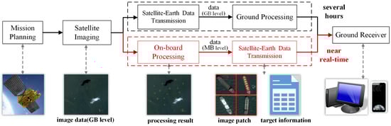 The traditional processing flow of ship detection from remote sensing images consists of mission planning, satellite imaging, satellite-earth data transmission, and ground processing. The ground processing scheme has time delay for ground users, and the satellite-earth data transmission system is under tremendous pressure. There are two bottlenecks for the further development of micro-nano satellites, i.e., the hysteresis of satellite-ground mutual communication of massive remote sensing images and the low efficiency of traditional information processing. On-board processing in micro-nano satellites is an effective way to improve the response speed to emergencies and provide immediate products for users. Figure 1 shows the comparison between on-board processing flow and the traditional ground processing flow. On-board image processing analyzes the remote sensing images directly on the satellite, and then only transmits the effective information to the ground receiver immediately. Compared with the traditional ground processing flow of ship detection, the advantages of on-board processing flow of ship detection are as follows: (1) the gigabyte level images are simplified to megabyte level target patches and information by on-board ship detection. It can reduce the compression, transmission and storage pressure for emergencies. (2) It simplifies the process of ground equipment and directly delivers the concerned information to users from the satellite. (3) Users can acquire information in near real-time while traditional processing flow needs several hours or days.