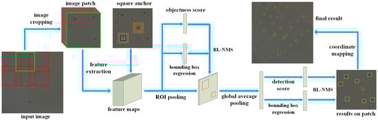To solve these difficulties, we adopt the strategies shown in Figure 2. We first crop the large scale remote sensing images into a series of 1024 × 1024 image patches, and then a lightweight model is employed to do feature extraction. The region proposals are generated by the Region Proposal Network (RPN) with square anchors. After Region of Interest (ROI) pooling layer and global average pooling layer, the bounding box regression and score of proposals are processed, followed by Bigger-Left Non-Maximum Suppression (BL-NMS) to remove redundant detection. Finally, the results in image patches are mapped into the input image coordinate to obtain the final result.