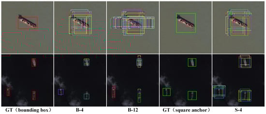 According to these two principles and the characteristics of large aspect ratio and wide size distribution of ship target, we design square anchors. Figure 3 shows some positive samples of different types of anchors, where B and S represent original anchor and square anchor respectively, followed by the number of anchors. For the ships in training set, we use K-means to select four scales and choose three aspect ratios to adapt the rectangular target at the same time. As shown in Figure 3, for the target orientation approximately 45, the square anchors (aspect ratio is 1) have better positive samples. However, for the target orientation 90 (or 0), B-4 cannot choose appropriate samples, and B-12 can select the positive samples close to the target. Compared with B-4 and B-12, positive samples of good quality can be selected by S-4 under various circumstances, which will provide good support for subsequent networks.