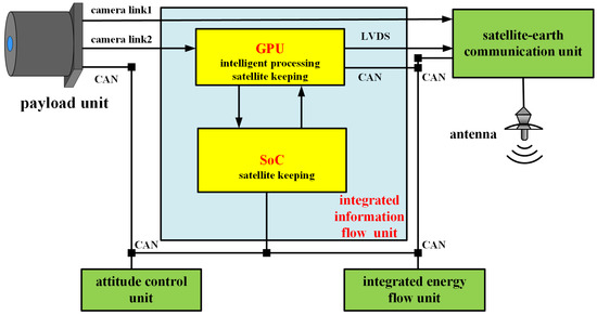 Figure 5 shows the hardware architecture of the integrated information flow. The information flow is interacted through CAN bus and satellite affairs, measurement, navigation and other functions are controlled through integrated information flow unit. The imaging of remote sensing payload unit is adjusted by integrated energy flow unit and attitude control unit, and then remote sensing images are transmitted to GPU and satellite-ground communication unit through camera link respectively. Target patches and information processed by GPU are transmitted to the satellite-ground communication unit through LVDS and then satellite-ground communication unit transmits these data to the ground receiver by antenna. The micro-nano satellite needs to choose the type of data (images or patches and information) with the limitation of the downlink capability.