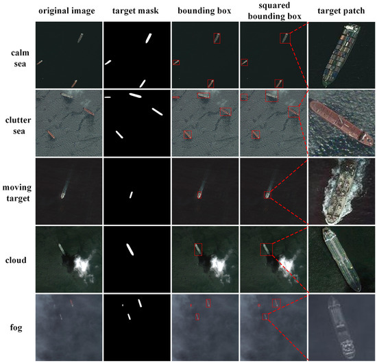 In order to verify the effectiveness of the scheme in this paper, we established a dataset collected from Google Earth for the lack of publicly available datasets for on-board ship detection. The dataset contains 95 images under different imaging conditions with the resolution of 1 m. Training set includes 65 images and the remainder are used as test images. The image size of our dataset ranges from 1500 × 1500 to 10,000 × 10,000 pixels. In total, there are 1397 ships in the training set and 435 ships in the test set. We rotated the training image 36 times (per 10 degrees) to generate different directions, and cropped 12,965 training samples with the size of 1024 × 1024 pixels from the augmented dataset. After data augmentation, 42,308 ships of different types, sizes and directions were used for training. We manually marked the ground truth of all ship targets to obtain the performance of our scheme. As shown in Figure 7, the mask of ship target was marked firstly, and then the minimum bounding rectangle of the connected area was calculated. Finally, the short side of the minimum bounding rectangle was stretched to be the same as the long side to ensure the final bounding box was square. At the same time, we only focus on ships larger than 20 pixels in length, and small ships with long wake are not labeled as positive samples, since their exact location is difficult for human eyes to distinguish. Our dataset includes images under different conditions, such as calm sea, clutter sea, moving target, cloud, and fog interference, which is appropriate for simulating the practical application.