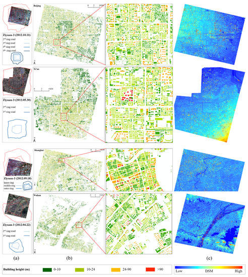 The location of the study areas (a), the pre-existing 3D building maps in 2012 (https://www.amap.com/) (b), and DSM maps generated by Ziyuan-3 multi-view images in 2012 (c) for the inner-city areas of Beijing, Xi’an, Shanghai, and Wuhan.