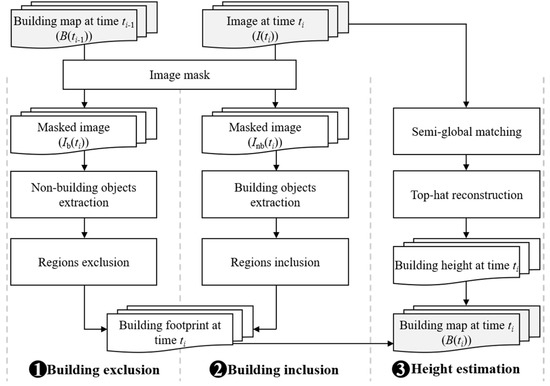 The time-series 3D building maps and their corresponding remote sensing images were denoted as B(ti) and I(ti) (i = 1, 2, …, n), respectively, and the pre-existing 3D building maps from Amap were denoted as B(t0). The basic idea of generating B(ti) (i = 1, 2, …, n) is considering B(ti−1) as the base layer and updating the temporally inconsistent building footprints through image-to-map (i.e., I(ti) to B(ti−1)) change detection, and then estimating the height of the newly constructed buildings. The basic idea of image-to-map change detection is detecting building and non-building objects from I(ti) in the non-building and building regions of B(ti−1), respectively, which can avoid unnecessary computation and minimize false alarms [52]. The procedure of generating time-series 3D building maps (including footprint and height for each building) consists of three steps: 1) building exclusion; 2) building inclusion; and 3) height estimation (Figure 3).