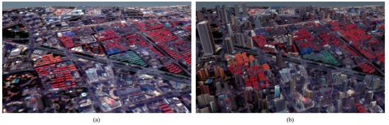 Urban functional zones (UFZs), such as residential, commercial, industrial, urban green space, public service, agricultural, open space, etc. (Table 3), provide different social, economic, and ecological functions, such as dwelling, commerce, landscaping, and industry [64]. Since UFZs are the basic units of urban planning and management in China, 3D urban redevelopment of the UFZs is of great concern. In this research, the UFZ types were mainly identified through visual interpretation of the high-resolution remote sensing data since they vary in terms of land cover composition and spatial variability. In addition, point of interest data in online map that providing names of restaurants, hotels, banks, hospitals, communities, companies, etc., and Baidu street view map were used to further validate its type. The building density (BCR and FAR) at the UFZ level was analyzed to reveal its change characteristics.