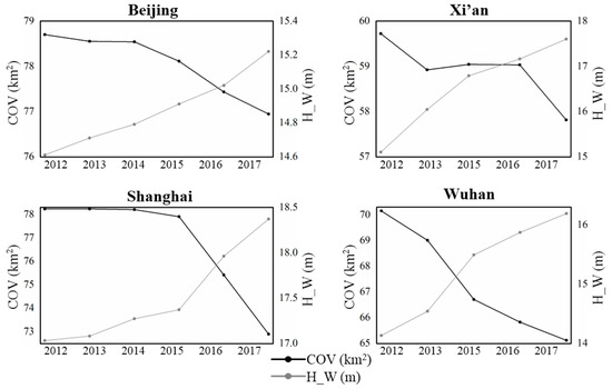Total building coverage (COV) and area-weighted average height (H_W) for the four Chinese megacities during 2012–2017.