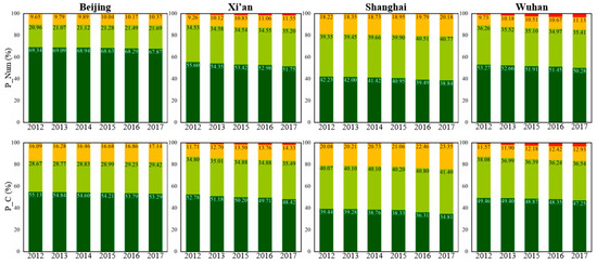 Additionally, as shown in Figure 6, for low-rise buildings in all four megacities, their number and coverage (P_Num/P_C) declined slightly from 2012 to 2017. The number and coverage for high and very high-rise buildings showed a steady increase, especially for very high-rise buildings in Xi’an and Wuhan, where the P_Num and P_C values nearly doubled over the five years. The increase of high-rise and very high-rise buildings and the decrease of low-rise buildings further demonstrates that the inner-city areas of Chinese megacities have witnessed vertical development to tackle the land scarcity problem [65].