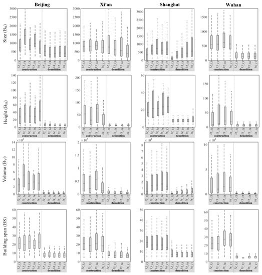 It is further revealed that the constructed and demolished buildings exhibit strikingly distinct characteristics (Figure 7). Compared to the demolished buildings, the constructed ones tend to have a significantly larger height, volume, and span for all the study areas throughout the whole period, which validates the finding that compact low-rise buildings have been replaced by open high-rise ones in the urban redevelopment. With regard to the building size, Beijing and Wuhan have larger values for constructed buildings compared to demolished ones, but no significant differences were found for Xi’an and Shanghai.