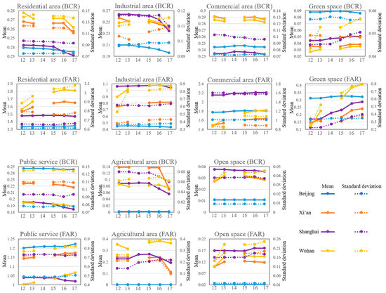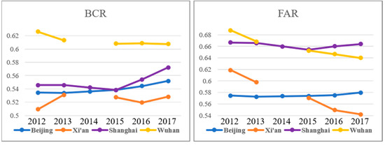- There has been a general reduction and increment of the mean BCR and FAR, respectively, in most of the UFZs, due to the fact that inner-city redevelopment has been dedicated to improving land-use efficiency and optimizing land-use structure.