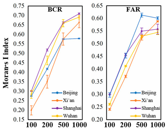 BCR and FAR were calculated within a grid cell (local neighborhood). BCR [65], the ratio of the building coverage area to the size of the local neighborhood, depicts the two-dimensional building density in each grid cell. FAR [65], the ratio of the gross building floor area to the size of the local neighborhood, measures the 3D building density in each grid cell. A larger FAR signifies a higher land-use intensity [66].