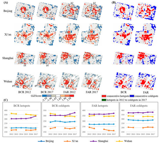 Spatial patterns of the building density metrics: (A) GiZscore map of BCR and FAR at the scale of 500 m; (B) temporal change of hotspots and coldspots; (C) the number of BCR hotspots, BCR coldspots, FAR hotspots, and FAR coldspots.