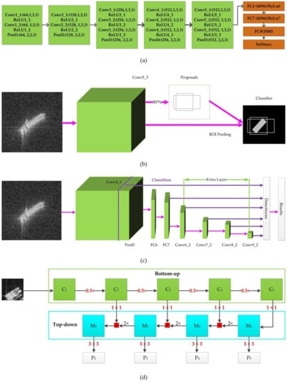 Faster R-CNN [26] consists of three main networks: the ConvNets to extract feature maps, the region proposal network (RPN) for generating region proposals, and a network using these proposals for object classification and bounding-box regression [26], as shown in Figure 9b. First, an image is fed to the deep convolutional networks (ConvNets) to obtain its feature maps, and then the RPN is employed to acquire a set of the rectangular object proposal and its corresponding object score. After that, region of interest (ROI) pooling resizes the rectangular object proposals to the same shapes. Finally, these converted object proposals are passed to the classifier to output their corresponding classes and the bounding boxes that include the ships. VGG16 was chosen as the ConvNets for ship detection. The architecture of the Faster R-CNN is illustrated in Figure 9b.