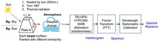 Figure 1 summarizes the operational concept of remote thermal signature measurement in sea/sky background. The research objective was to estimate the AS-CRI of a target surface (chimney) heated by solar energy under different weather conditions. The target has four surfaces painted with different emissivities. The surface heated by direct sunlight was rotated after thermal equilibrium (20 min) to determine the thermal radiation of each surface. The thermal energy radiated by the rotated surface passes through the atmosphere, which alters the spectral radiation. The atmospheric transmittance changes according to the molecular contents, such as carbon dioxide and water vapor. Additional thermal energy coming from the path was added to the remote surface radiation. This thermal radiation was recorded using a Michelson interferometer (TELOPS-HYPCAM-MWE, 374 bands in 1.5–5.5 m) and the spectra were obtained by applying the fast Fourier transform (FFT) to the interferograms.