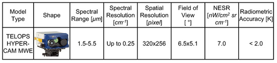 Figure 3 shows the camera specifications. The hyperspectral radiance image cube (spatial resolution, 352 × 288; spectral resolution, 374 bands in 1.5–5.5 m) data was obtained by the consecutive FFT and wavelength/radiometric calibration. This model can provide a high-resolution spectrum using a Michelson interferometer from the shortwave to midwave band [26]. The spectral resolution is user-selectable up to 0.25 [cm]; the noise equivalent spectral radiance (NESR) was 7 [nW/(cm sr · cm)]; the radiometric accuracy is approximately 2 K. Such high sensitivity and accuracy is possible because the high-sensitivity sensor is combined with automatic high-efficiency calibration sources (hot black body, ; cold black body, ). An automatic weather station (AWS) recorded the environmental weather information per 10 s. The controlled field experiment was conducted three times (11:00, 14:00, and 16:00) a day between January to August in 2018. Details are explained in the following sections.