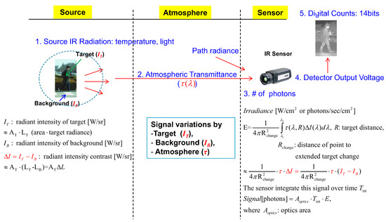 Figure 4 shows the general scenario with various components in IR sensing processing, such as the source (target), atmosphere, and sensor. As indicated in the figure, the most important parameters are the contrast radiant intensity ( [W/sr]) between the target and background and atmospheric transmittance () because they are the basic input parameters of IR sensor systems.