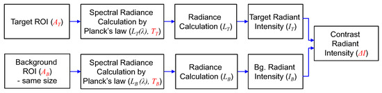 The general CRI calculation procedure follows the NATO SIMVEX (Ship Infrared Model Validation Experiment), as shown in Figure 5 [27,28]. The radiant intensity of the target ( [W/sr]) was calculated by multiplying the emissivity of the target (), target radiance ( [W/sr/m]), and target area ( [m]) defined in Equation (1).