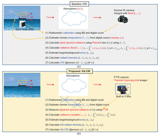 Although the conventional CRI measure described in the previous section can provide a quantitative radiant intensity value, it has three limitations. First, it is difficult to measure the temperature (T) of remote targets and background due to the small blackbody size and time-varying atmospheric conditions. An inaccurate temperature leads to an inaccurate calculation of the spectral radiance (). Second, it is difficult to measure the target emissivity () correctly in the real world. Third, the unknown and time-varying atmospheric transmittance () in Equation (1) is the most critical problem. Therefore, it is almost impossible to estimate the actual radiant intensity arriving at sensors. Moreover, there is no spectral information in the CRI that is useful for target detection and thermal stealth analysis. Figure 6a summarizes the steps required to acquire the CRI at the sensor point of view not the target side. First, a blackbody-based radiometric calibration is required to measure the physical target and background temperatures. This process is unstable because the atmospheric transmittance is time-varying. Second, the target and background temperatures are estimated using the digital count of a normal IR camera. Third, the ideal spectral radiance is calculated using the Planck’s law. Fourth, sensed radiance is calculated using the target emissivity, atmospheric transmittance, and integral with a fixed wavelength range. This step is required to extract a physical quantity for the sensor point of view. Fifth, the area of the target and background is estimated using the IFOV of camera and the target distance. Sixth, radiant intensity can be calculated by multiplying the radiance and area. Final CRI at the sensor is obtained by subtracting the target radiant intensity and background intensity.