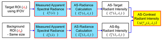 where is the measured spectral radiance using a Fourier transform infrared (FTIR)-based hyperspectral imager. The apparent spectral target radiance is measured in the sensor point of view, as shown in Figure 4(right). On the other hand, the spectral target radiance is measured on the target surface, as shown in Figure 4(left). The background radiant intensity () can be obtained using the same process with the same target size () using Equation (7).