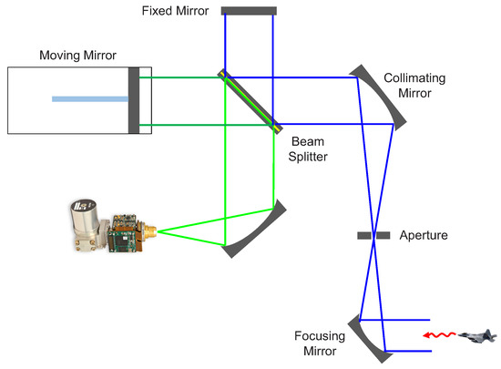 The apparent spectral radiance () is the core measurement information used in the AS-CRI calculation. A passive open path Michelson interferometer can be adopted for outdoor remote sensing applications [30]. Figure 8 presents the mechanism of a passive open path Michelson interferometer to acquire the interferogram. The focusing mirror of the Michelson interferometer receives an input radiation from a remote target. The collimated beam is divided into two paths through the beam splitter. Two beams reflected from the fixed mirror and moving mirror are recombined [31]. Two mirrors can make a path difference after the beams reflect off the mirrors. The recombined two beams generate an interference pattern (interferogram) that is recorded in the detector (InSb).