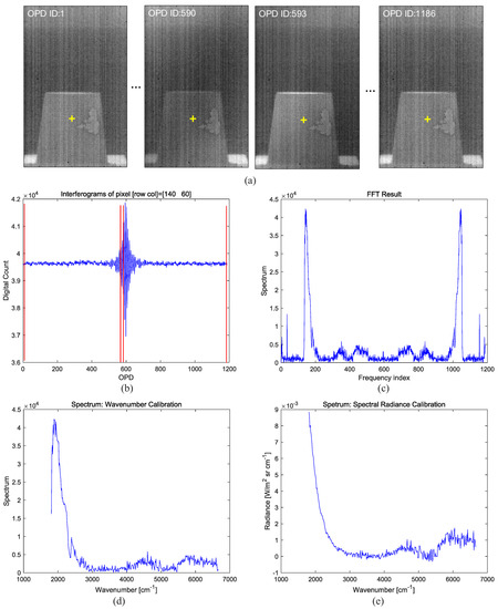 Figure 9a presents sample interferogram images at various optical path difference (OPD) indices, such as ID = 1, 590, 593 (zero path difference), 1186. Figure 9b gives an example of the whole interferogram at a pixel (140, 60). The red lines indicate the OPD IDs used in Figure 9a. Figure 9c shows the results of spectrum extraction by applying the FFT to the interferogram (Figure 9b). The unit of the y-axis in Figure 9c is just the spectral intensity in arbitrary units. Figure 9d shows the wavenumber [cm]-calibrated spectrum using the Nyquist sampling theorem and HeNe laser with 632.8 nm. Figure 9e presents the finally estimated spectral radiance [W/(m sr · cm)] at the same pixel calibrated using the hot/cold blackbody and Planck’s law.