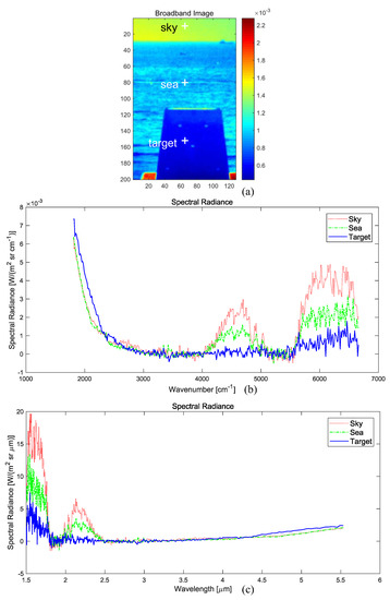 The final conversion form is because the two terms should be equal in the integral. For example, if [W/(m sr cm)], where cm, then [W/(m sr m)] because [W/(m sr cm)] × (2081 cm)1 m/(10m). Figure 10b,c present the unit conversion of the spectral radiance for the sky, sea, and target pixels, as indicated in Figure 10a. Please note that there is strong atmospheric absorption of the sky pixel in the short wavelength band (1.5–1.8 m) due to water vapor.