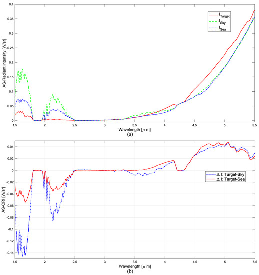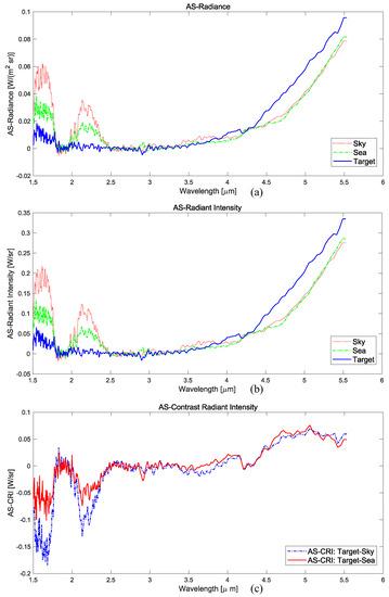 In the first experiment, the AS-CRIs of the target-sky and target-sea were extracted according to the wavelength by applying Equation (5) to all 234 hypercubes. Figure 17a presents the calculated AS-Radiant Intensity for the target, sky, and sea regions. In the short wavelength band, the sky region showed the highest AS-Radiant Intensity followed in order by the sea and target regions. On the other hand, the target region showed the highest AS-Radiant Intensity in 4–5.5 m. Figure 17b shows the final AS-CRIs by subtracting the background (sky, sea) AS-Radiant Intensities from the target AS-Radiant Intensity. The AS-CRIs of the target-sky and target-sea showed negative values in 1.5–2.5 m; the former showed stronger negative contrast than the latter. The AS-CRI of the target-sea showed a positive contrast from 3.5 m and that of the target-sky showed positive contrast from 3.85 m.