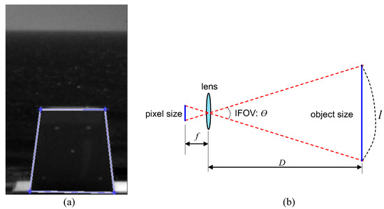 Assume that l denotes a physical length corresponding to IFOV. D is the target distance; is IFOV; f is the focal length, and N is the number of target pixels. The final target area can be calculated using Equations (10) and (11). For example, if [rad], [m], , then [m] and [m.
