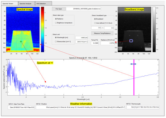 Figure 14 shows the developed software platform to display the acquired hyperspectral IR data in terms of the spectral image at a specific band, spectral profile at a selected point (’+’), and broadband image with a selected spectral range. The band range can be adjusted for broadband image generation. The brightness temperature and radiance can be calculated using the adjustable ROI and band range in Figure 14(right). The spectral unit can be either the wavelength (m) or wavenumber (cm) by unit selection.