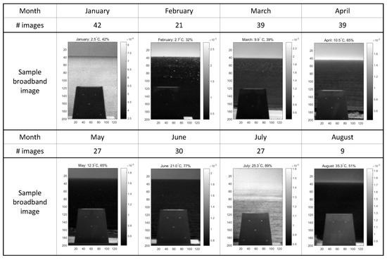 The total number of valid hyperspectral images of plate-D was 234, where each image provides a hypercube. In addition, and AWS recorded the environmental weather information, such as the date, time, plate ID, wind speed, maximum wind speed, wind direction, maximum wind direction, air temperature, ground temperature, humidity, air pressure, visibility, current, solar LW Radiation, and LW Temperature, including 5 target surface temperatures (TD1, TD2, TD3, TD4, and TD5), and inner temperatures (TD6 and TD7) measured by thermocouples, as shown in Table 1. Figure 15 summarizes the monthly database size with sample broadband images, including the atmospheric temperature and humidity. Note the wide variations of the target and background (sky and sea) according to the different weather conditions with qualitative analysis.