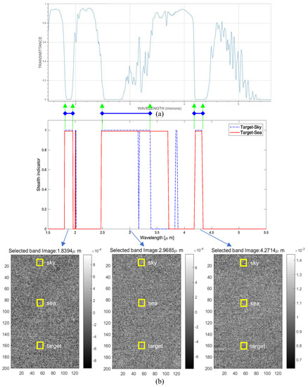 Visualization of stealth bands of AS-CRI for target-sky and target-sea: (a) atmospheric transmittance using the MODTRAN, (b) stealth bands and corresponding examples of a specific spectral band image measured on 12 April 2018, 11:00 (temperature: 12.8°, humidity: 75%).