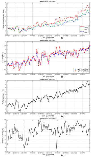 In the second experiment, the daily AS-CRI was extracted using the maximum AS-CRI band (3.8–5.5 m) obtained in the previous experiment to evaluate the daily/monthly/seasonal variations. Figure 20 presents the AS-CRI(3.8,5.5) trend according to different measurement dates starting from 2017.12.27 to 2018.08.31 with a fixed observation time (11:00). As shown in Figure 20a, the AS-Radiant Intensity(3.8,5.5) of the target, sky, and sea increased according to the seasonal observations (winter, spring, and summer). The AS-CRI(3.8,5.5) showed similar behavior as the seasons changed (Figure 20b). In contrast, the AS-CRI(3.8,5.5) showed low values on rainy days, such as 2018.03.26 and 2018.05.30. Figure 20c,d shows the daily air temperature and relative humidity. The AS-CRI strength in summer is five times higher than that in winter.
