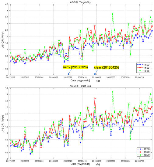 Comparative analysis of daily AS-CRI according to the measurement time (11:00, 14:00, 16:00): (a) AS-CRI for the target-sky, (b) AS-CRI for the target-sea.