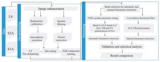 The preprocessing stage in digital image processing is an important step, which needs to be done in order to reduce the atmospheric effects that exist in optical remotely sensed imagery [41]. Therefore, this stage was performed on both the L8 and S2A multispectral data to enhance the quality of the raw imagery utilized in this study. Similarly, the radar image should also be preprocessed by speckle filtering and terrain correction (orthorectification) in order to reduce the existing speckle noise and to geometrically correct it so that it reflects the real Earth’s surface as close as possible. The abstracted graph of the framework followed in the present study, including the image preprocessing and processing stages, is shown in Figure 2.