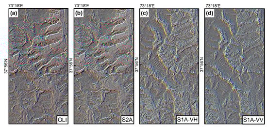 The RGB composite images of three optimal filtered directions (0, 45, and 90) from (a) OLI band-6, (b) S2A band-11, and (c,d) S1A VH and VV polarizations, respectively.