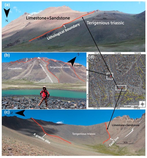 Some examples of verified lineaments in the field: (a–c) Field photographs of the verified lineaments, (d) directionally filtered PGB image of S1A VH polarization with lineaments extracted (in black), verified lineaments (in red), and digitized fault lines (in yellow).