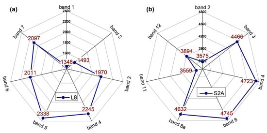 Landsat-8 (a) and Sentinel-2A (b) dataset bands and the numbers of auto-extracted lineaments.