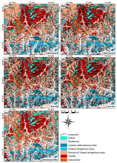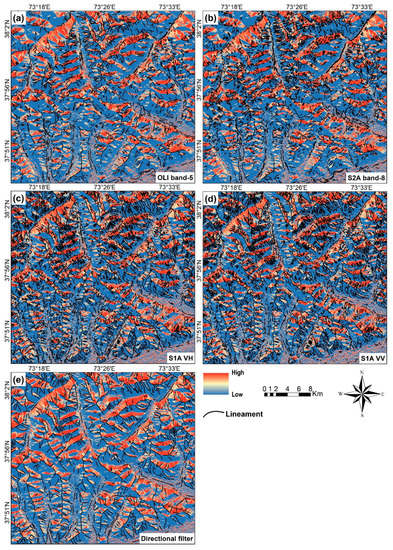 The superposition of lineaments extracted automatically from (a) OLI band-5, (b) S2A band-8, and (c,d) S1A VH and VV polarizations respectively, in addition to the (e) lineaments extracted manually from the directionally filtered RGB color composite image on the Lithologic map [37].