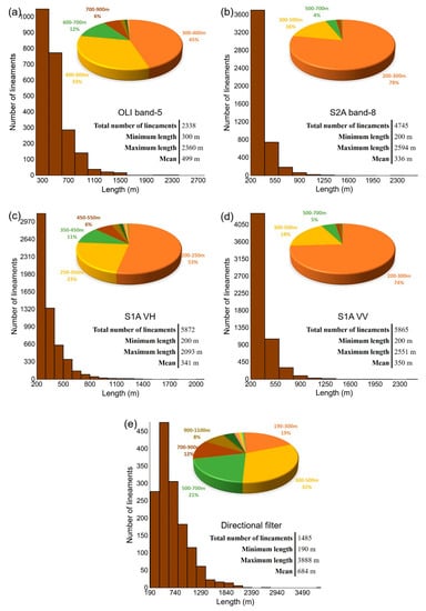 The distribution histograms giving information of the number of lineaments according to the length and occupational percentage for the automatically extracted (a) OLI band-5, (b) S2A band-8, and (c,d) S1A VH and VV polarizations respectively, as well as the manually extracted (e) directionally filtered RGB color composite image.