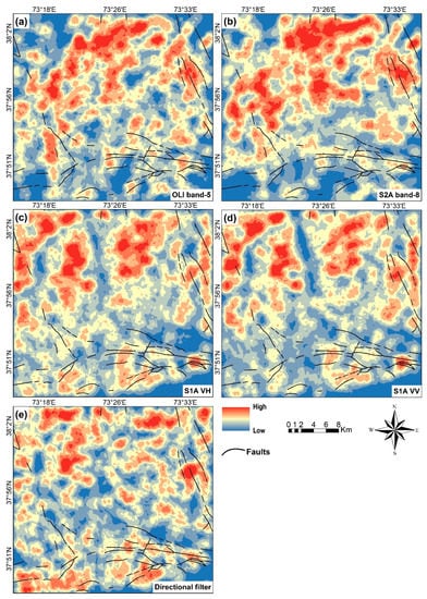 Further, all seven bands of L8 and a same number of bands (VNIR and SWIR) of S2A datasets were compared in terms of the contrast and definition of geological structural features. As a result of the visual inspection, band-6 from the L8 and band-11 from the S2A datasets, which record the information at the central wavelengths of 1.6085 mm and 1.6137 mm, respectively, corresponding to the SWIR-1 channel, were selected for this stage of the study. These channels show better contrast on the geological structures compared to the other channels. The selected channels from the two used optical datasets are equivalent to band 5 of Landsat-7 which is widely used for directional filtering in numerous studies [17,81,89,90].