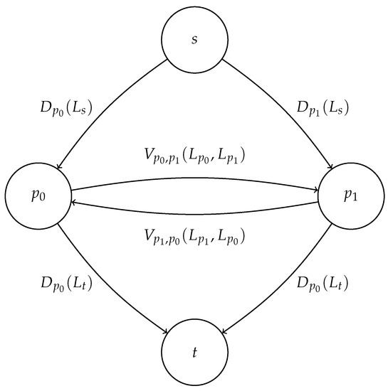 A flow network with a source node s, a sink node t, two non-terminal pixel nodes and , and the energies used as the edges’ weights.