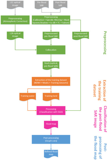 Flowchart of the automatic flood mapping process including the preprocessing, the extraction of the training dataset, and the classification.