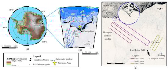 Study site and Chinese Antarctic expedition settings. (a) The location of the Chinese flagship scientific research station, Zhongshan, in east Antarctica, overlaid on the Bedmap2 Antarctic ice sheet surface elevation map. (b) The coastal environment near Zhongshan station. In November each year, R/V Xuelong usually traverses through westerlies and the drift ice zone of the Prydz Bay to approach and re-supply the polar expedition team. The landfast sea ice near shore often extends 30–40 km from the Larsemann Hills. The background Antarctic ice sheet mosaic is the LIMA from USGS. (c) The programmed path of three missions. Note the dashed circle close-up in upper part: The Sentinel-2 optical satellite happened to capture the moment on 29 November 2016, when the R/V Xuelong (black linear feature) was trying to break the outer boundary and pierce into the landfast ice. It was held still a few kilometres past that position, and then anchored there.