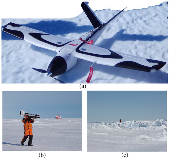 UAS model illustration and field work scenes. (a) Polar Hawk-III model. Refer to Section 3.1 for the model’s detailed specifications. (b) Holding the model, the operator is about to cast it into air to deploy the vehicle. Note the R/V Xuelong, 400 m in the background. (c) A photo of a small area of rough ice. The stiff ice floes stand out chaotically, up to about 0.5∼1 m. Please refer to the person (height: 1.75 m) behind for physical scale.