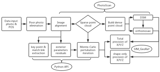 Point precision assessment was carried out using Monte-Carlo approaches, implemented in the MATLAB-based SfM_georef toolkit [12]. The software includes functionality to evaluate point cloud precision, and its principle is fully described in James et al. [36]. By iteratively and randomly adjusting camera model parameters using a Gaussian distribution, each point in the sparse cloud would migrate in 3D space around its original coordinates (i.e., the original (x,y,z) location before the Monte-Carlo analysis). The magnitude of point migration can be regarded as the proxy of product precision [36]. To amount for the above statistics of the exterior orientation, the mean standard deviations of position and orientation residuals were initialized as the representative perturbation for 5000 times. The total error was partitioned into two components: The portion induced from internal image network, and the portion induced from external POS records. Our Python scripts and data are available in the Supplementary Materials. All processing steps were summarized in Figure 3.