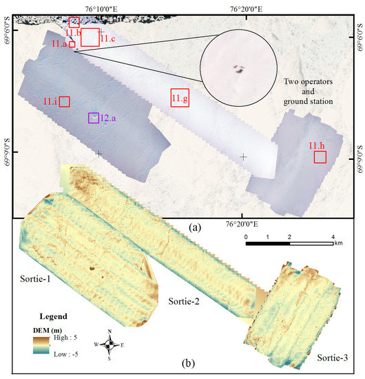 The standard products of the structure from motion (SfM) software, exported from Agisoft® PhotoScan v1.2.4: (a) The mosaic images after ortho-rectification. The darker tone in the sortie-1 orthomosaic is due to the lower solar altitude angle, as compared with that of sortie-2 and sortie-3. The circular close-up shows two operators and the ground station in a flat area 400 m ahead of the R/V Xuelong. See Figure 2b,c for the in-situ environment. (b) The digital surface models (DSM) of three sortie projects. Note that systematic biases include the slight ‘doom effect’ and high frequency jitters along the flight course. Please refer to Figure 1c for their respective flight courses and geographic locations.