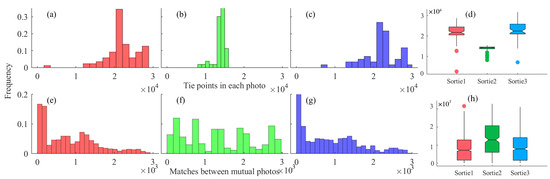 The histogram of tie-points quantity distribution in each photo from the three sorties: (a) Sortie-1, (b) sortie-2, and (c) sortie-3, (d) The notched box plot of the previous variable in the three sorties. The histogram of match quantity distribution in mutual photo pairs from the three sorties: (e) Sortie-1, (f) sortie-2, and (g) sortie-3, (h) The notched box plot of the previous variable in the three sorties. Note that the scale of the horizontal axis in the histogram plot is the same as that of vertical axis in the box plot in each row.