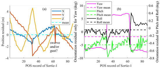 A similar pattern appears for the orientation residuals (Figure 7b), but with mean bias offsets, which are positive for roll, yet negative for yaw and pitch. The most mysterious pattern occurs in yaw angle. Not only is the variation magnitude (left Y-axis) almost one order larger than that of pitch and roll (right Y axis), but also it oscillates back and forth coarsely. The same thing also happens in the other two sorties in Figure 8d; thus, we speculate the IMU might loss its fixation in the yaw dimension (see Section 5 for more discussion). Alternatively, this could reflect the wind’s influence—if the wind was coming from a constant direction during sortie-1, it would cause the yaw to be offset one way when the drone was flying north (for example), and the opposite way when the drone was flying south. Overall, it can be safely inferred that the Z and yaw measurements in the POS records are not reliable and, therefore, contribute the most to error adjustment.
