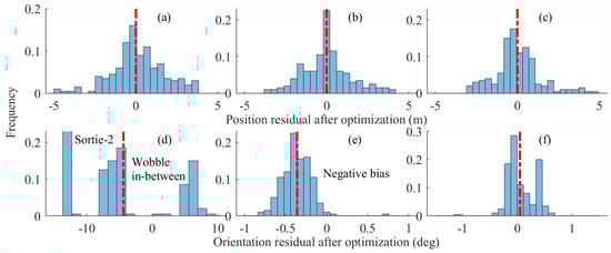 The residual distribution from all three sorties are summarized in Table 2 and Figure 8. Except for yaw, the remaining five residual error components show a centralized, normal-like distribution, which corroborates the hypothesis in a later Monte-Carlo simulation [36]. Reasonably, the standard deviation of the yaw has to be excluded, as the input for next step’s evaluation.